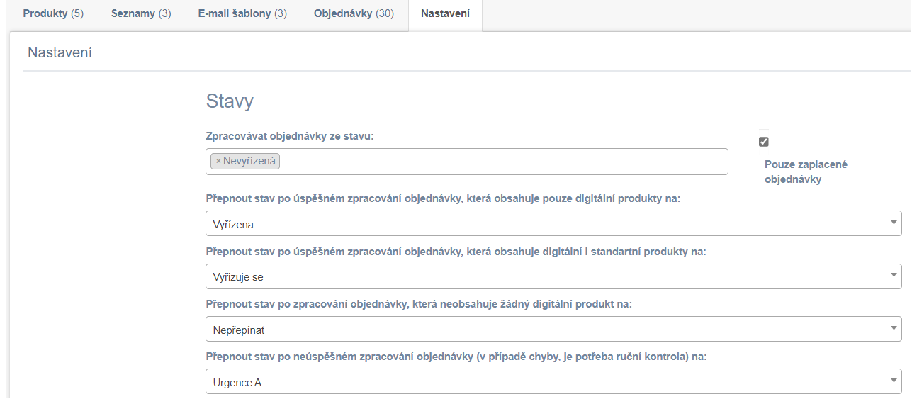 Alapvetően ki kell választani, hogy a kiegészítő melyik állapotból dolgozza fel a megrendeléseket, hogy csak a kifizetett megrendeléseket dolgozza-e fel, és azt is javasoljuk, hogy állítsa be, hogy a kiegészítő a feldolgozás után milyen állapotba állítsa át a megrendelést. Fontos az állapot hiba esetén is – amikor a kiegészítő nem tudja elküldeni a terméket az ügyfélnek. Javasoljuk, hogy hozzon létre egy állapotot a Shoptetben – például Sürgősség A, amelyhez hozzáadhat egy állapot-e-mailt, amelyben elnézést kér az ügyféltől.