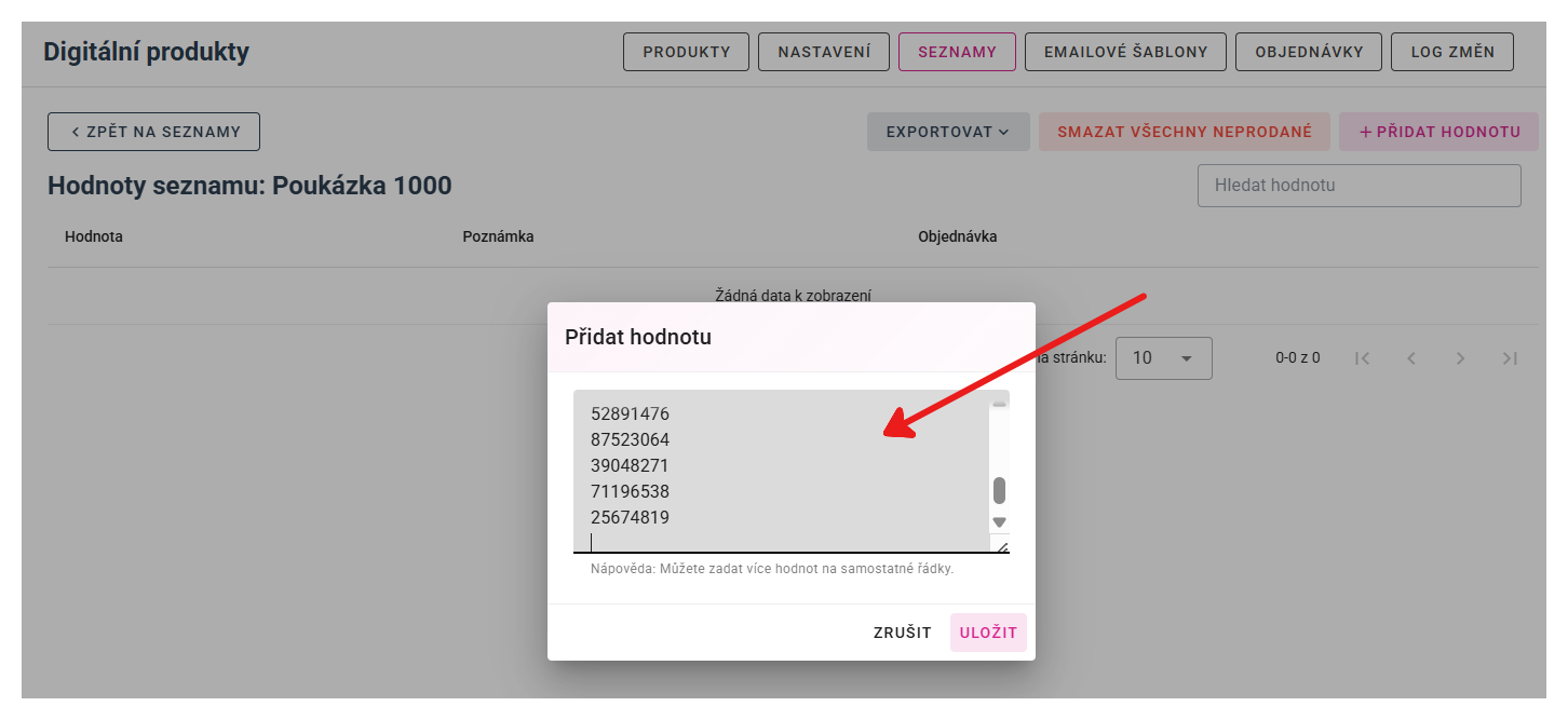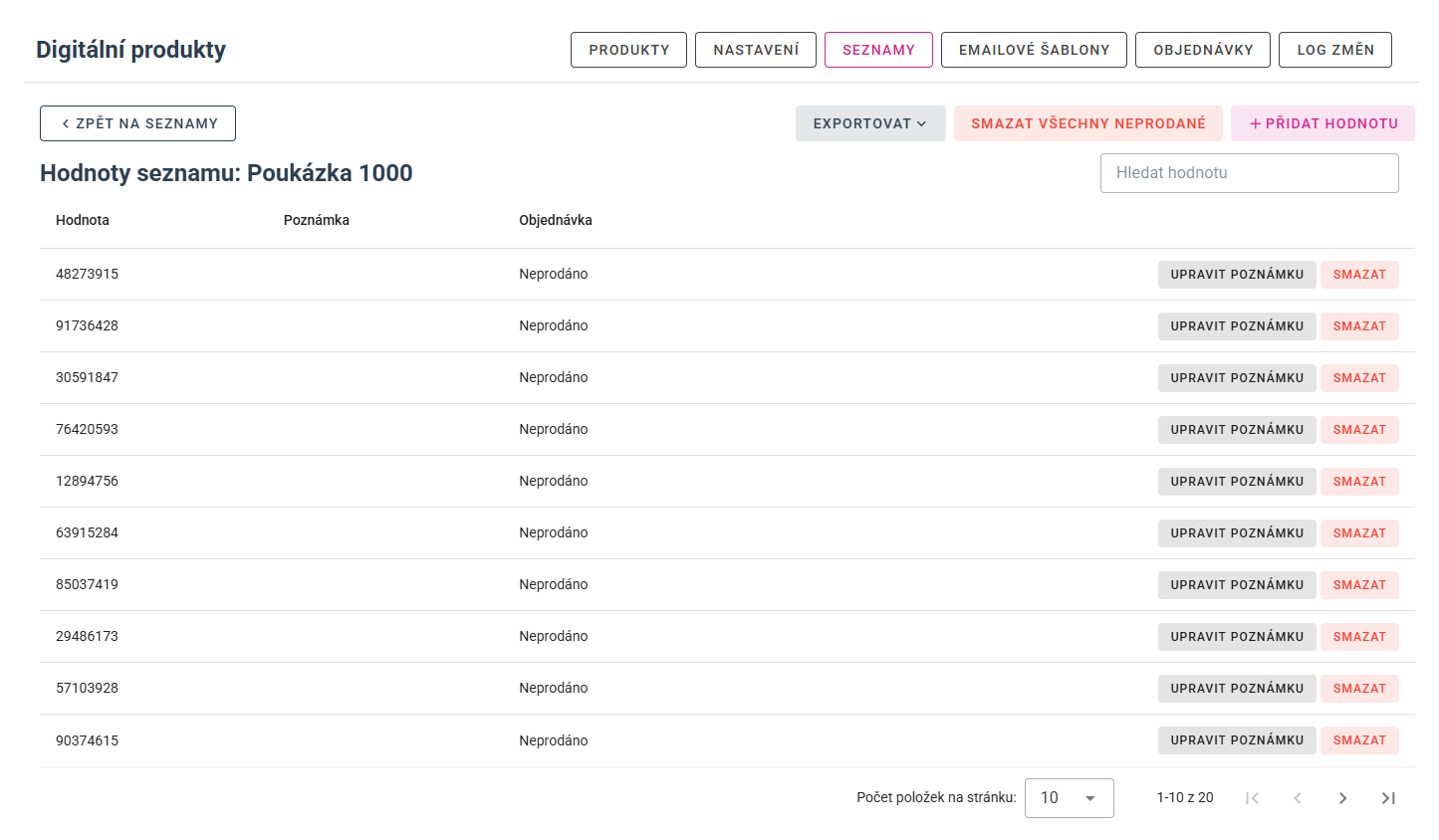 Lista, amelynek segítségével kezelheti az ügyfeleknek elküldendő egyes rögzített értékeket. Ezeket az értékeket a rendszer automatikusan elküldi az ügyfeleknek a megrendelés feldolgozása során, és az áttekintésben mindig láthatja, hogy melyik érték került elküldésre melyik megrendeléshez. Ha az értékek készlete kimerül, egyszerűen pótolhatja őket ugyanúgy.